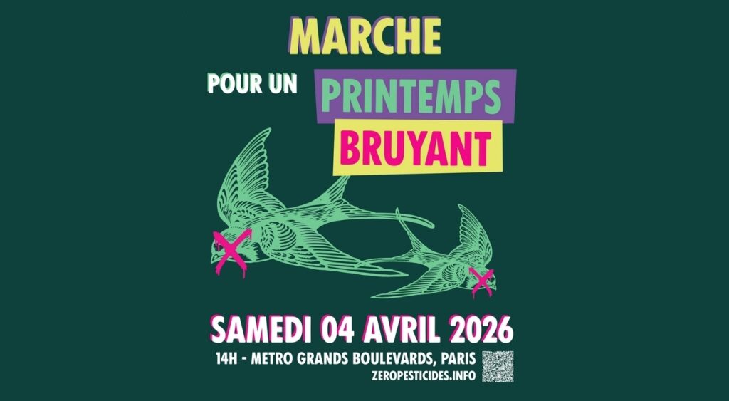 Le 4 avril 2026 se tiendra une mobilisation contre les pesticides « Marche Printemps Bruyant » à l’initiative de divers collectifs. Les printemps se font silencieux. Les oiseaux disparaissent, les insectes pollinisateurs meurent par milliards, la santé de tous les êtres humains est mise en danger, à commencer par les travailleuses et les travailleurs de l’agriculture. La cause ? Un modèle agro-industriel centré sur l’utilisation massive de pesticides de synthèse.