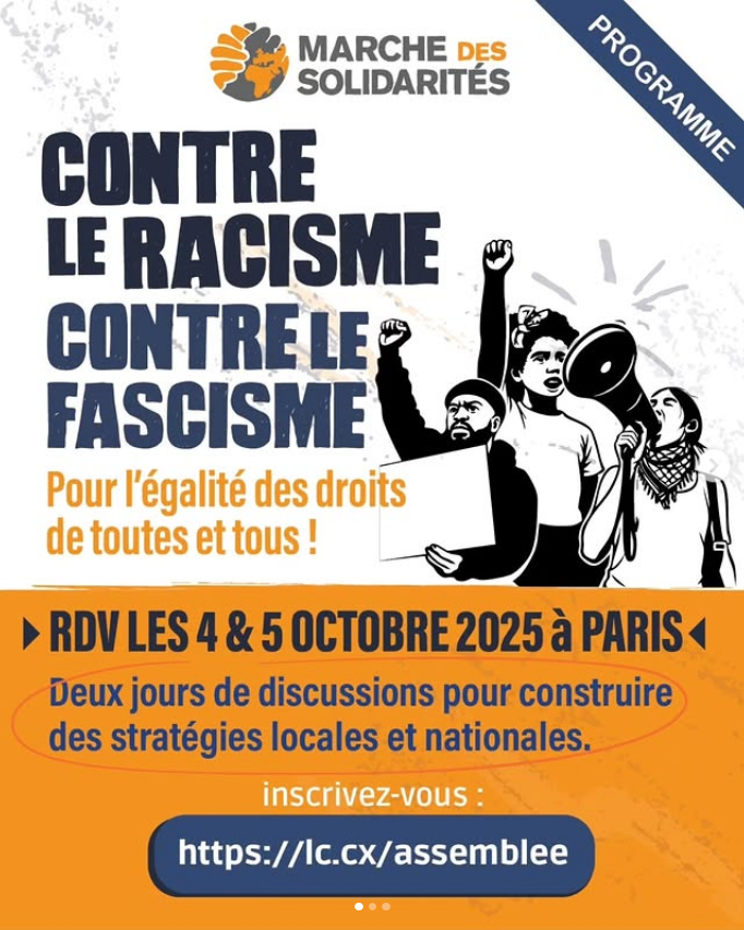 Le 4 et 5 octobre, la plateforme de la Marche des Solidarités invite l’ensemble des individus, collectifs, réseaux, syndicats, associations, partis qui veulent s’organiser et se battre contre le racisme, le fascisme et pour l’égalité des droits à venir participer à un weekend d’assemblée collective à Paris pour échanger ensemble autour d’une feuille de route commune et sur les moyens que nous nous donnons pour s’organiser dans chaque ville, village et quartier.