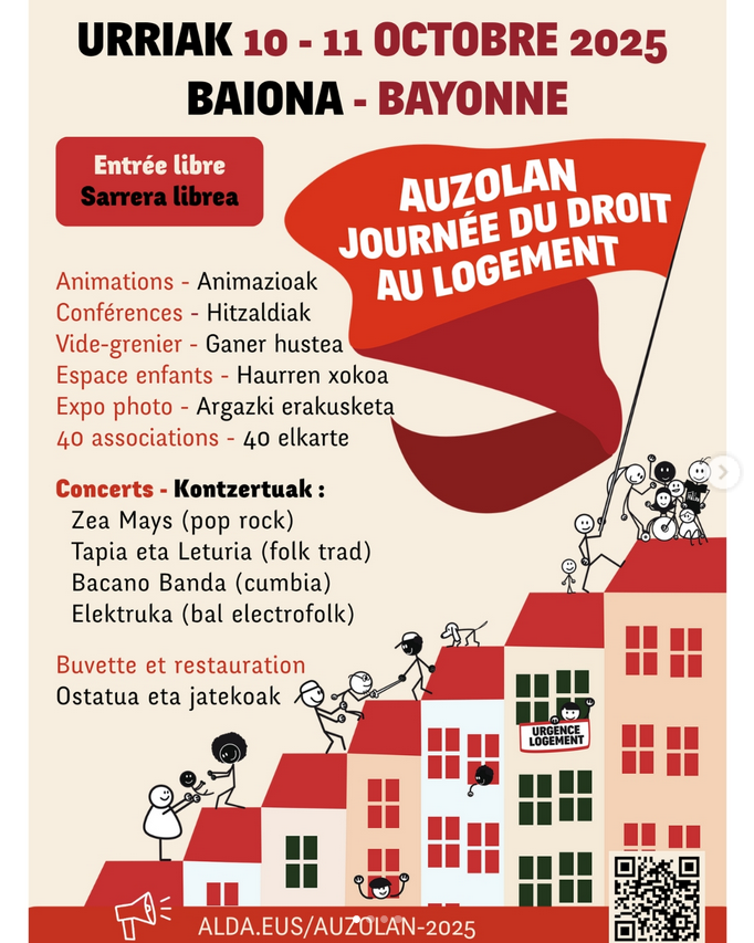 Vendredi 10 octobre au soir et samedi 11 octobre 2025, à Bayonne, Alda organise la 2ème édition d’Auzolan – La journée du droit au logement, un temps fort de fête et de mobilisation pour défendre le droit de vivre et se loger au Pays.