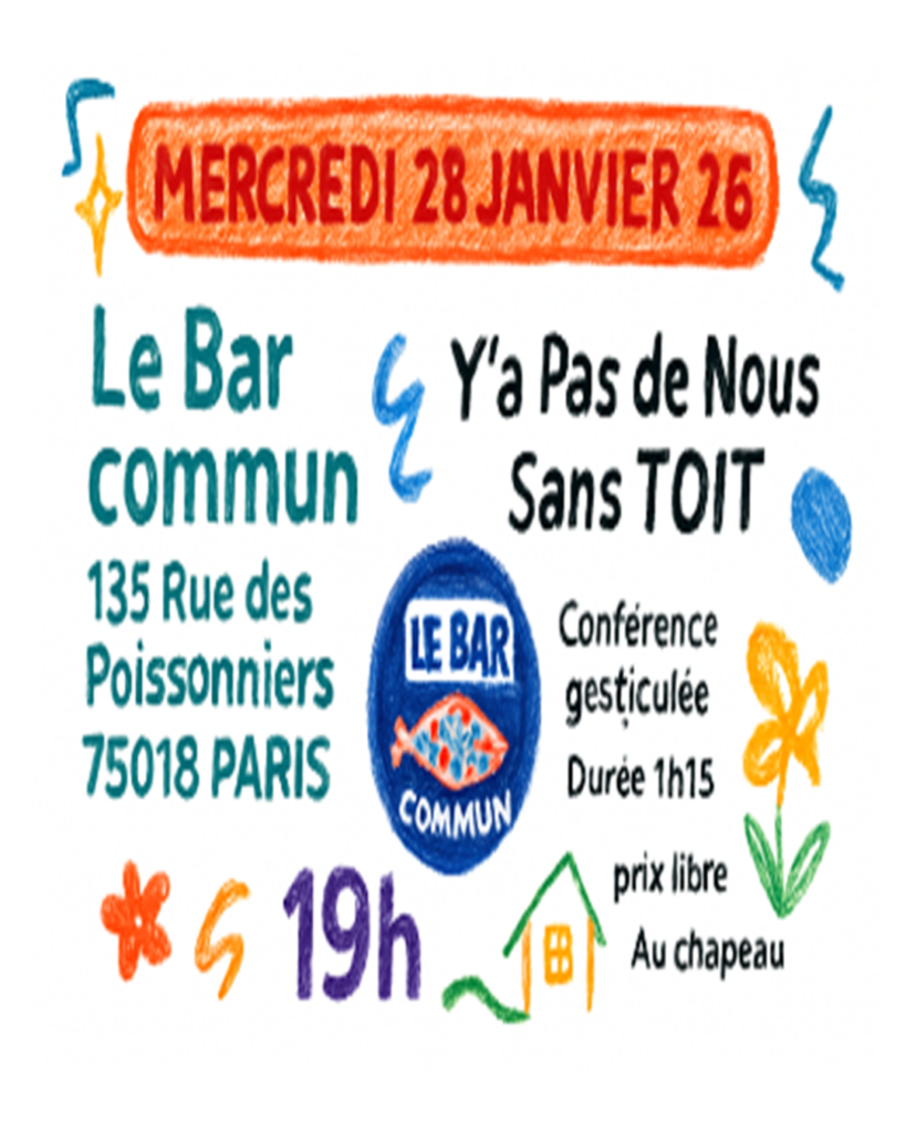 Le 28 janvier 2026 aura lieu au Bar en Commun (Paris 18e) la conférence gesticulée « Y a pas de nous sans TOIT ».