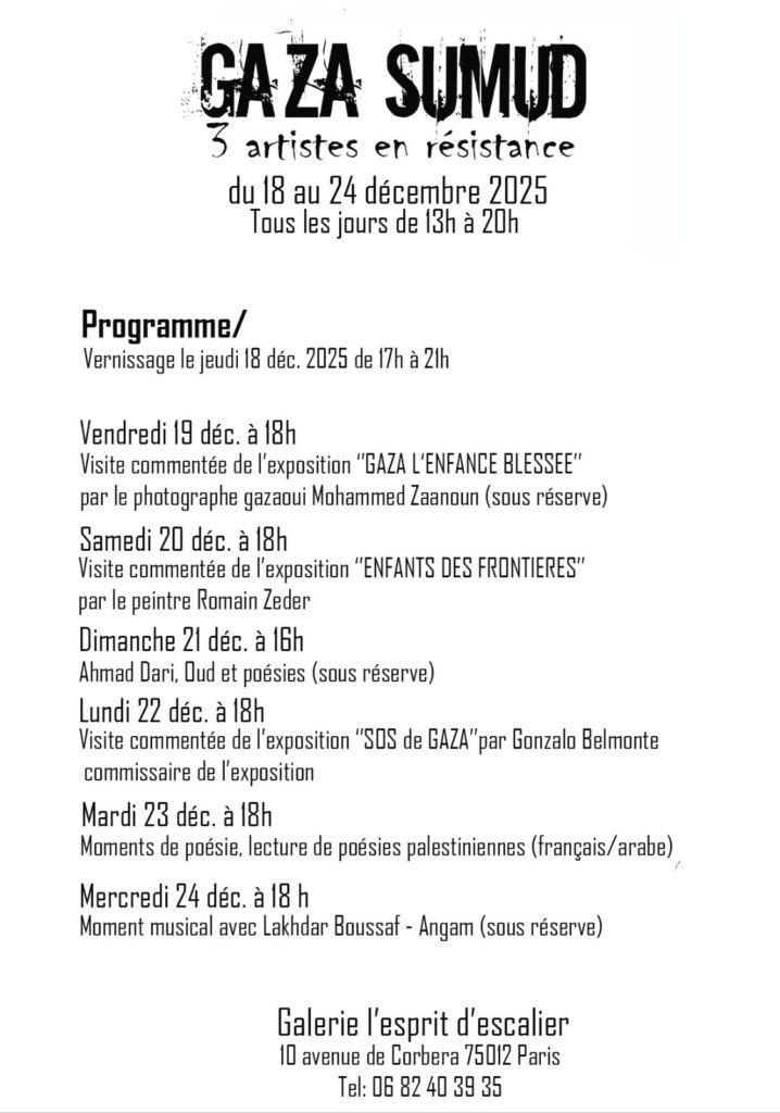Du 18 au 24 décembre 2025 se tiendra une exposition « Gaza Sumud, trois artistes en résistance » regards croisés de plusieurs artistes palestiniens.