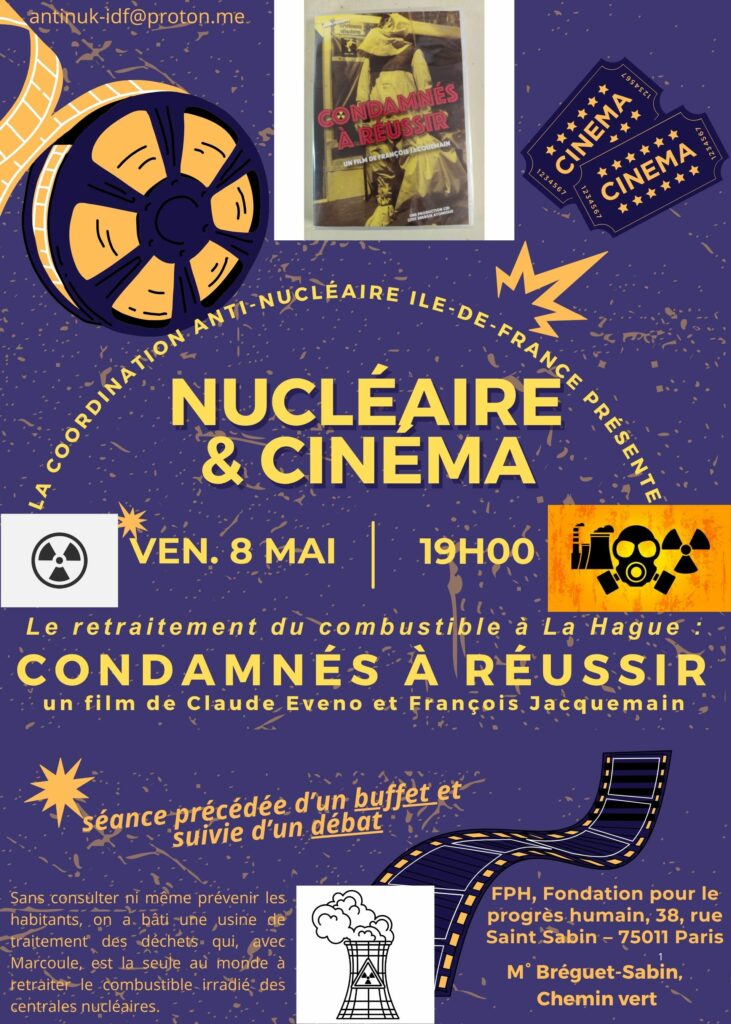 Le 8 mai 2026 la Coordination antinucléaire d’Ile-de-France invite à une projection de « Condamnés à réussir » précédée d’un buffet et suivie d’un débat à Paris.