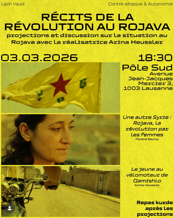 Le 3 mars 2026 une rencontre-projection est organisée par le collectif Contre-Attaque et Autonomie et l’Assemblée des femmes kurdes du canton de Vaud, autour de la révolution au Rojava à Lausanne.
