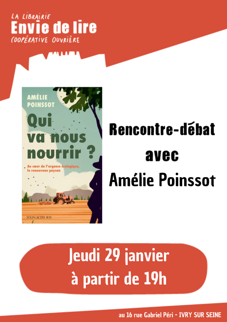 Le 29 janvier 2026 une rencontre-discussion est organisée avec Amélie Poinssot pour son livre « Qui va nous nourrir ? », précédée d’un petit grignotage, à la librairie Envie de Lire à Ivry-sur-Seine (94).