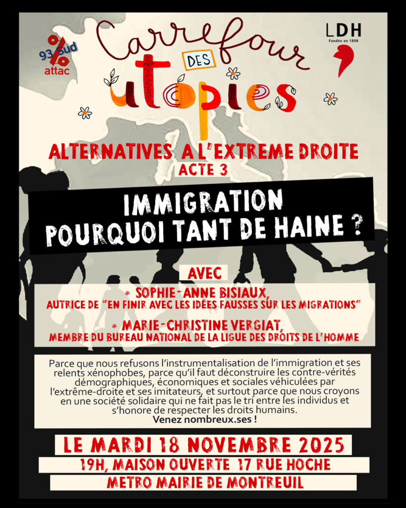 Le 18 novembre 2025 le débat « Immigration, pourquoi tant de haine ? » est organisé par le groupe Attac de Montreuil (Attac 93 Sud) et la LDH 93.