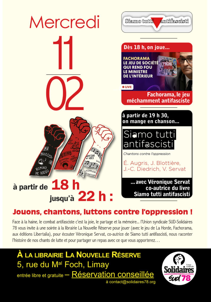 L’Union syndicale SUD-Solidaires 78 vous invite à une soirée à la librairie La Nouvelle Réserve pour jouer (avec le jeu de La Horde, Fachorama, Éditions Libertalia), pour écouter Véronique Servat, co-autrice de ’’Siamo tutti antifascisti’’, nous raconter l’histoire de nos chants de lutte et pour partager un repas avec ce que vous apporterez… et … chanter peut-être …