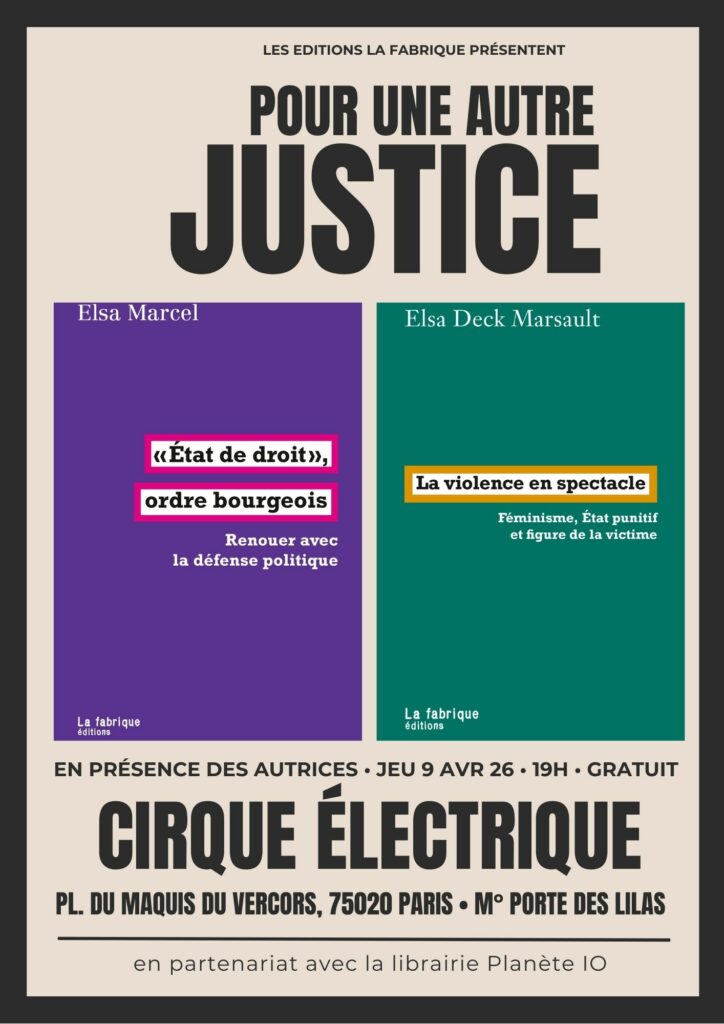 Rencontre « Pour une autre justice » en présence d’Elsa Deck Marsault (« La violence en spectacle ») et Elsa Marcel (« État de droit, ordre bourgeois ») jeudi 9 avril 2026 à 19h au Cirque électrique (Place du Maquis du Vercors, 75020 Paris), en partenariat avec la librairie Planète Io.