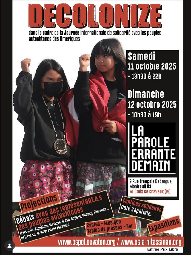 Les 11 et 12 octobre se tiendra un week-end de solidarité internationale avec les peuples autochtones des Amériques à la Parole Errante de Montreuil, co-organisé par le CSIA et le Comité de solidarité avec les peuples du Chiapas en lutte.