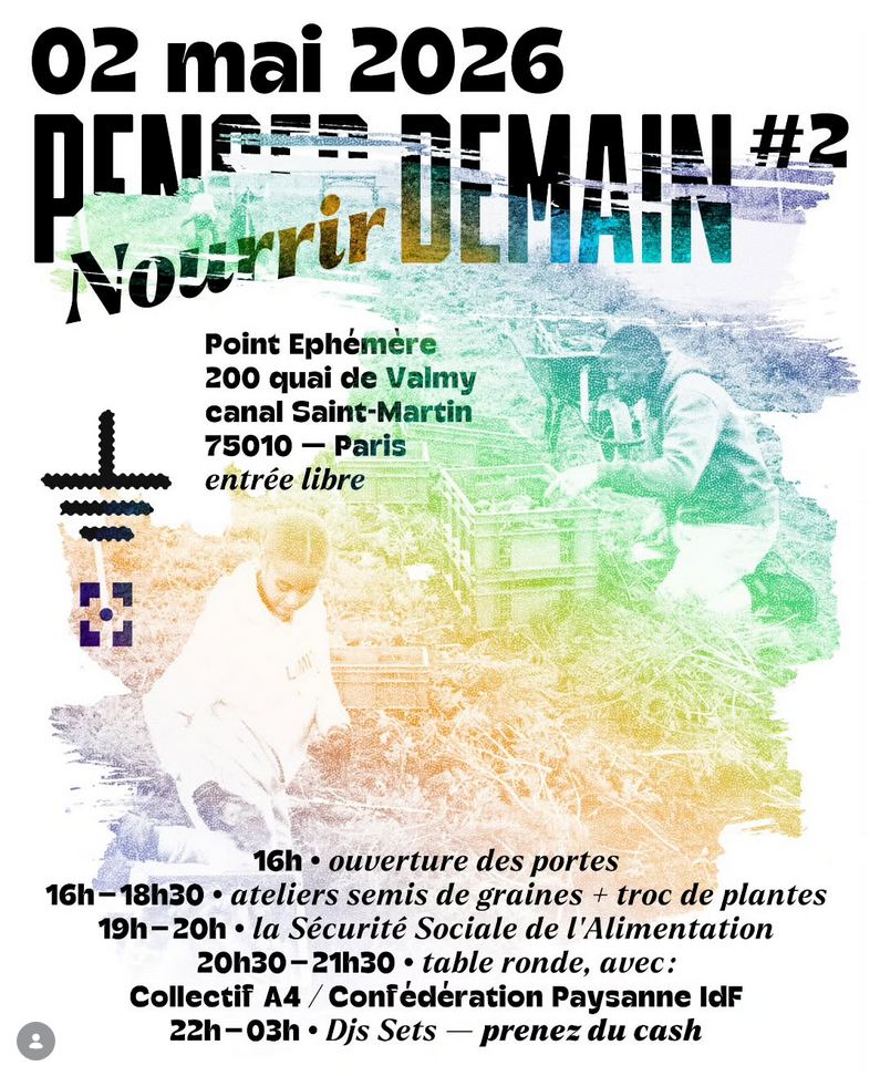 – suivie d’une table ronde réunissant plusieurs collectifs, dont A4 et la Confédération Paysanne, qui échangeront ensemble sur ce projet qui pourrait bien faire trembler le lobby agro-industriel : ses bases théoriques, ses expérimentations concrètes, et surtout ce qu’il ouvre comme horizon collectif. Parce qu’on ne peut plus continuer à s’empoisonner, et qu’on mérite mieux que les logiques marchandes qui gouvernent nos assiettes, la SSA est une réponse à la hauteur pour sortir de l’alimentation-marchandise, faire du droit à se nourrir une conquête sociale et politique.