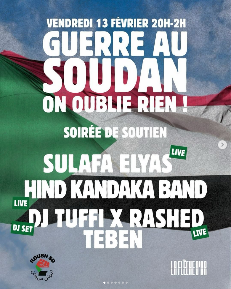 Le 13 février 2026 une soirée de soutien avec le peuple soudanais est organisée à la Flèche d’Or à l’initiative de l’association Koush.