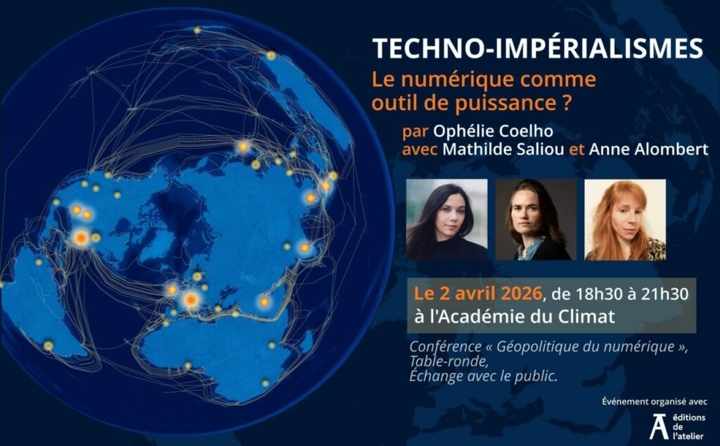 18h30 – Conférence assurée par Ophélie Coelho. L’autrice présentera une lecture géopolitique du numérique attentive à la matérialité des réseaux, à leurs logiques d’implantation et aux configurations territoriales qu’ils produisent. L’intervention proposera une mise en perspective des chaînes de dépendance et des rapports de puissance qui structurent l’actualité internationale.