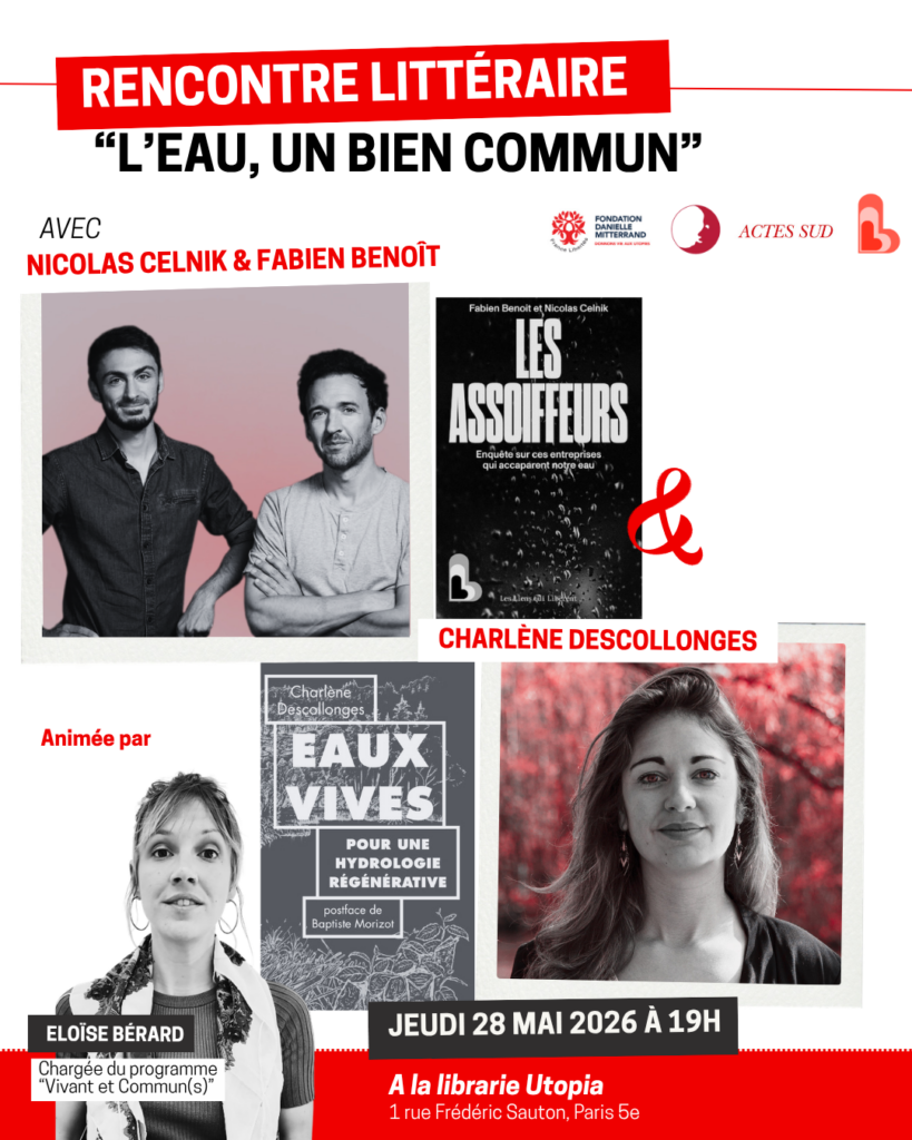 Le jeudi 28 mai 2026, la Fondation Danielle Mitterrand anime une rencontre autour des livres Les Assoiffeurs de Nicolas Celnik et Fabien Benoît (sorti le 8 avril 2026 aux éditions Les Liens qui Libèrent) et Eaux Vives. Pour une hydrologie régénérative de Charlène Descollonges (sorti le 4 février 2026 aux éditions Actes Sud ) à la librairie Utopia.